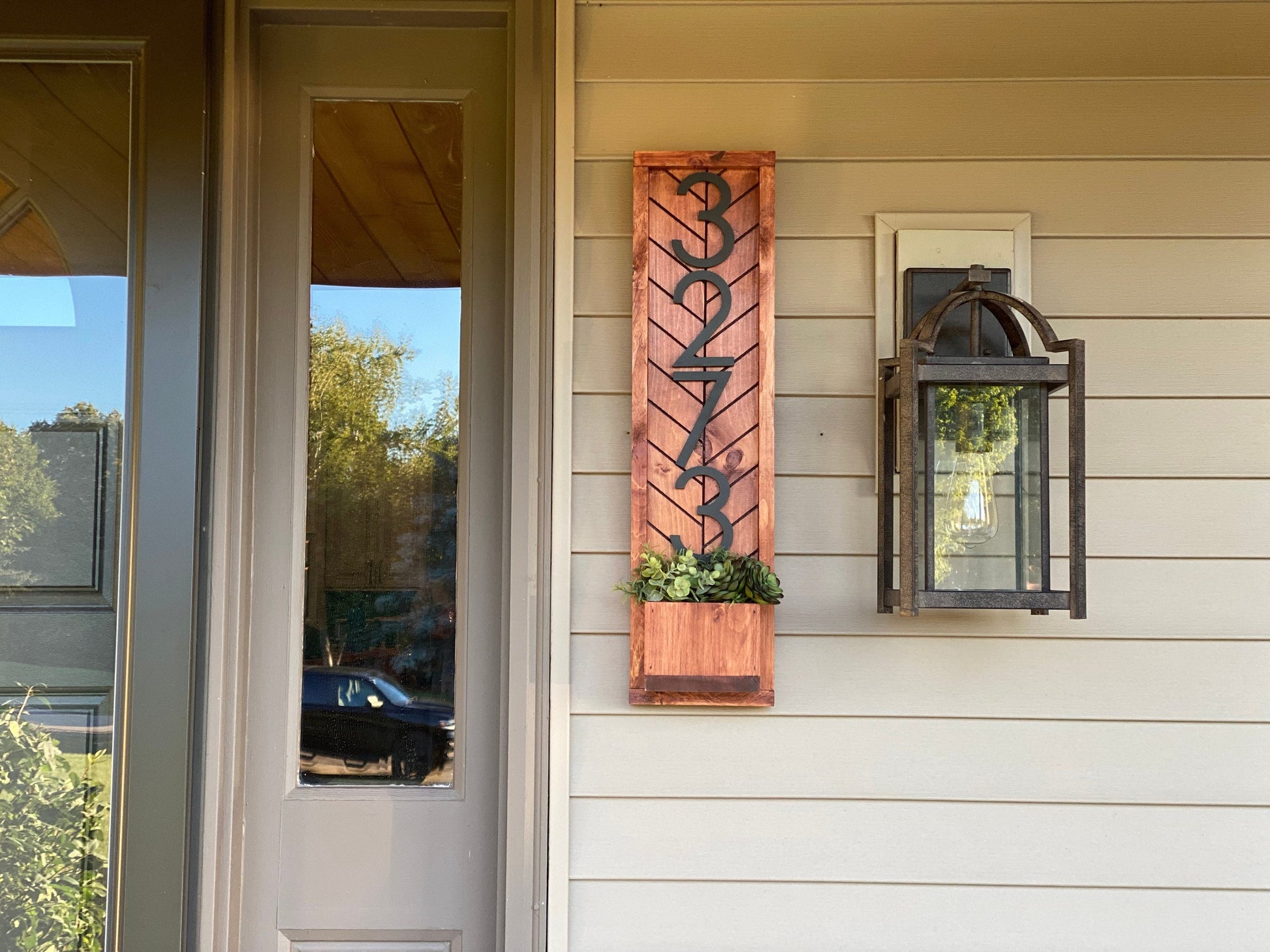 Add a touch of modern elegance to your home with this personalized vertical address sign with planter. This unique housewarming gift features sleek house numbers on a stylish address plaque, perfect for adding a personalized touch to your lawn. Welcome guests in style with this stunning address numbers display.